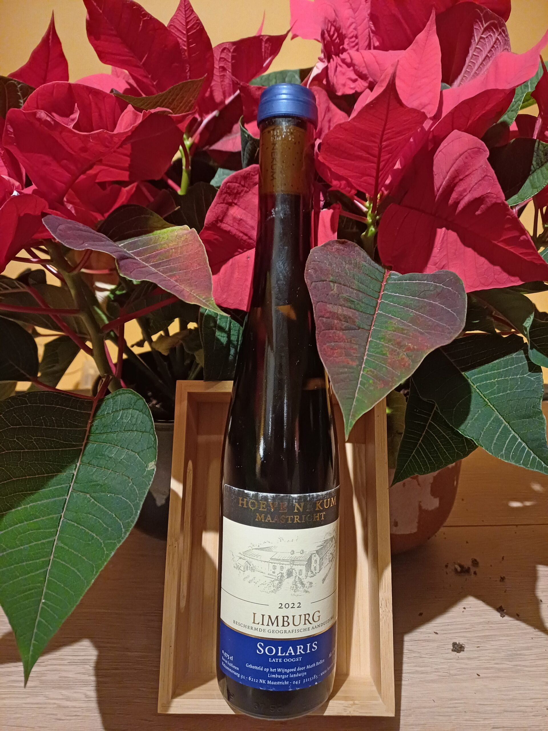 Een erg goed gelukte late harvest wijn van 100% Solaris Vol zoet tropisch fruit, honing en mooie kruideigheid. Lekker bij een gatenkaasje